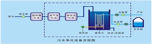 原水由經(jīng)細格柵后流入調(diào)節(jié)池中,在調(diào)節(jié)池中混合調(diào)節(jié)以后進入缺氧池,在缺氧池水解反應后由提升泵將原水送入第四代膜生物反應器,經(jīng)第四代膜生物反應器后的產(chǎn)水經(jīng)紫外消毒設備,直接回用。