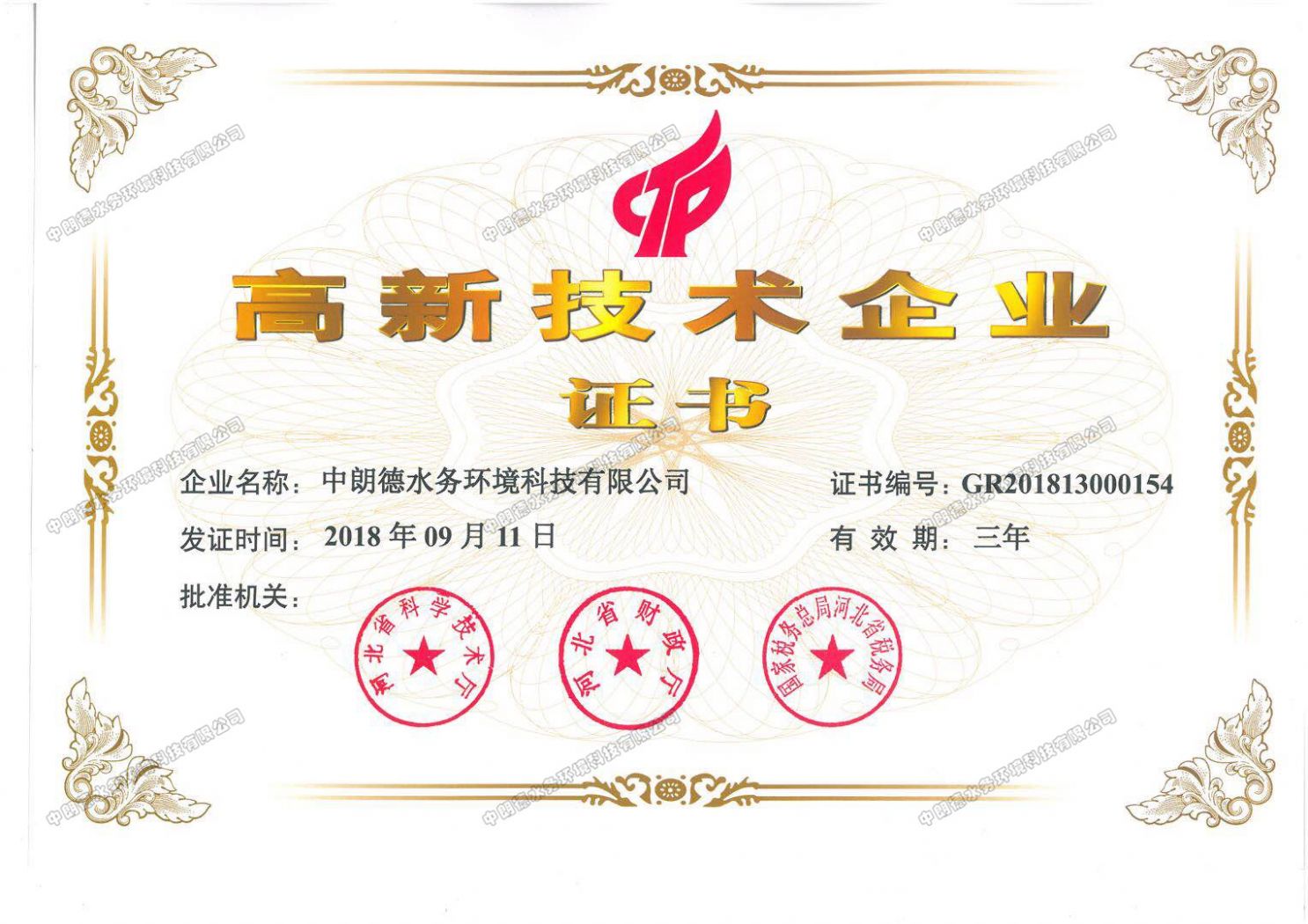 根據(jù)國(guó)家《高新技術(shù)企業(yè)認(rèn)定管理辦法》和《高新技術(shù)企業(yè)認(rèn)定管理工作指引》的相關(guān)規(guī)定,經(jīng)過(guò)嚴(yán)格審核,我公司收到了由河北省科學(xué)技術(shù)廳、河北省財(cái)政廳、國(guó)家稅務(wù)總局河北省稅務(wù)局聯(lián)合頒發(fā)的“國(guó)家高新技術(shù)企業(yè)”認(rèn)定證書(shū),憑借著專(zhuān)業(yè)的研發(fā)隊(duì)伍、雄厚的技木實(shí)力、持續(xù)的創(chuàng)新能力、科學(xué)的企業(yè)管理,中朗德水務(wù)環(huán)境科技有限公司將繼續(xù)在高新技術(shù)企業(yè)行列中穩(wěn)步前行,爭(zhēng)取更大的突破!