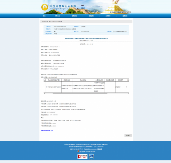 熱烈祝賀中朗德水務(wù)環(huán)境科技有限公司于2019年09月11日在廊坊“大城縣19所衛(wèi)生院和婦幼保健站一體化污水處理設(shè)備采購(gòu)項(xiàng)目”的投標(biāo)活動(dòng)中,一舉中標(biāo)!